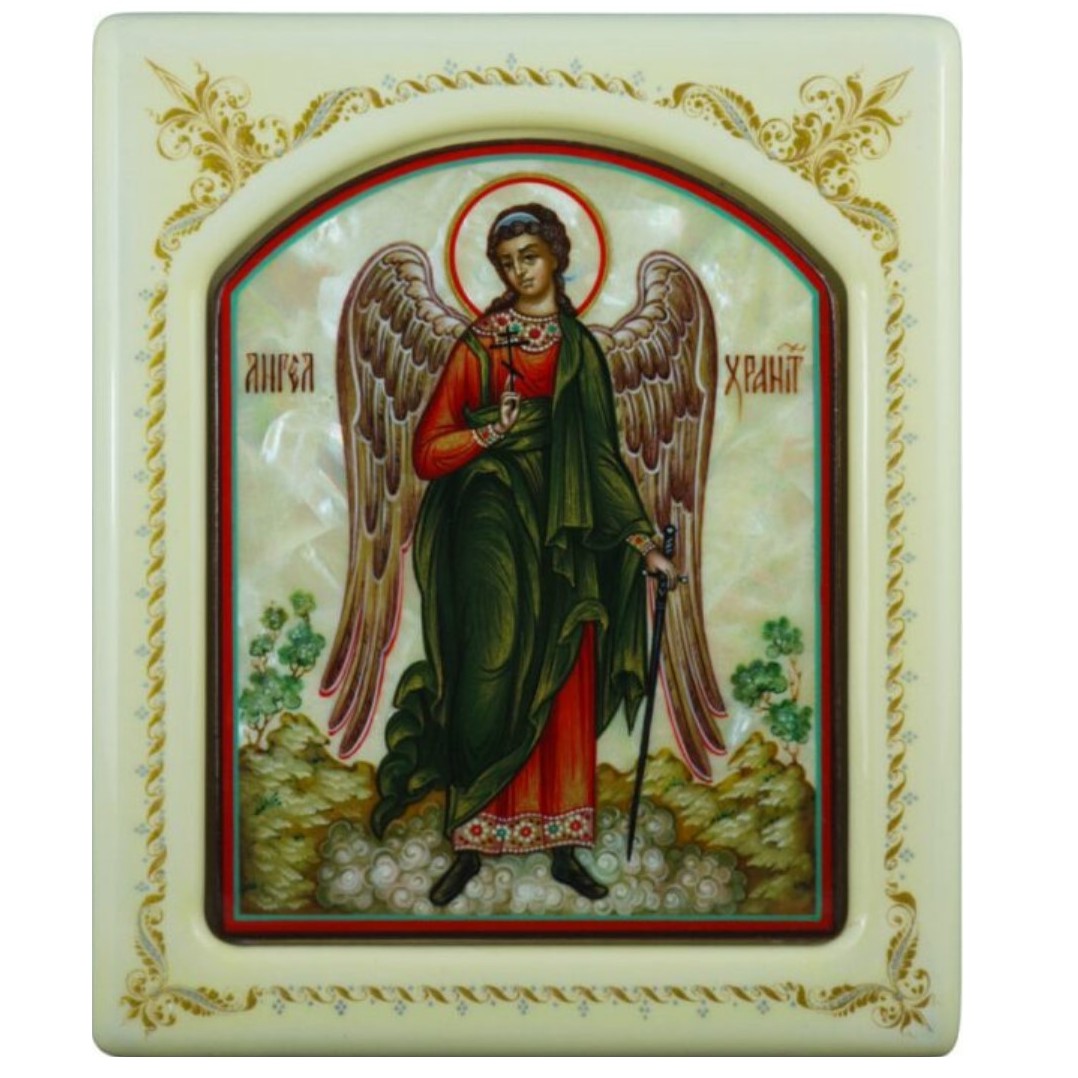 Икона с перламутром "Ангел Хранитель" в белой раме с орнаментом