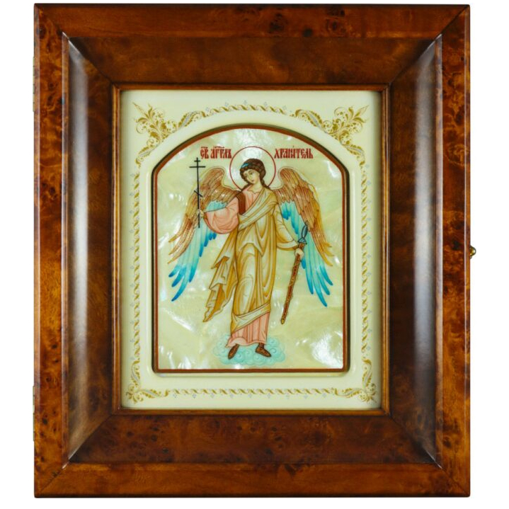 Икона в белой раме и киоте "Ангел Хранитель" на натуральном перламутре