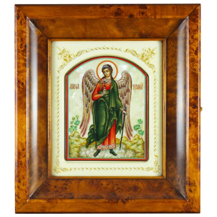 Икона в белой раме и киоте "Ангел Хранитель" на натуральном перламутре