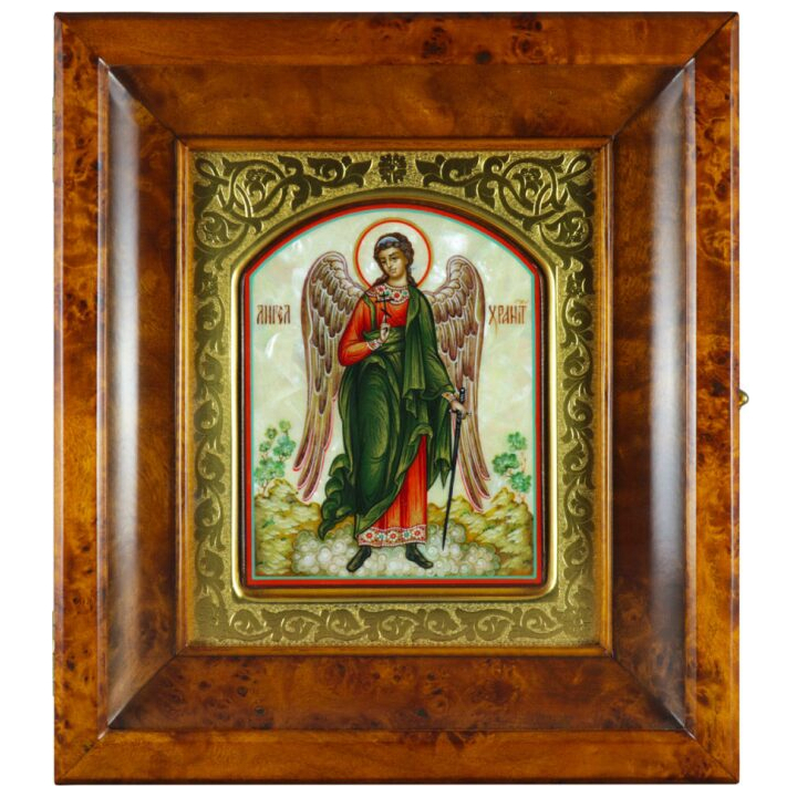 Икона в золотой раме и киоте "Ангел Хранитель" на натуральном перламутре