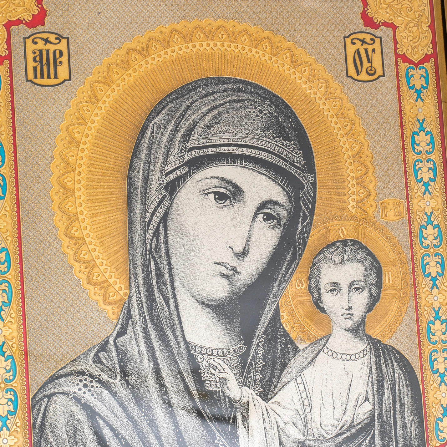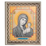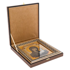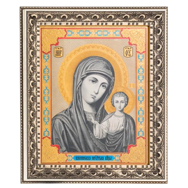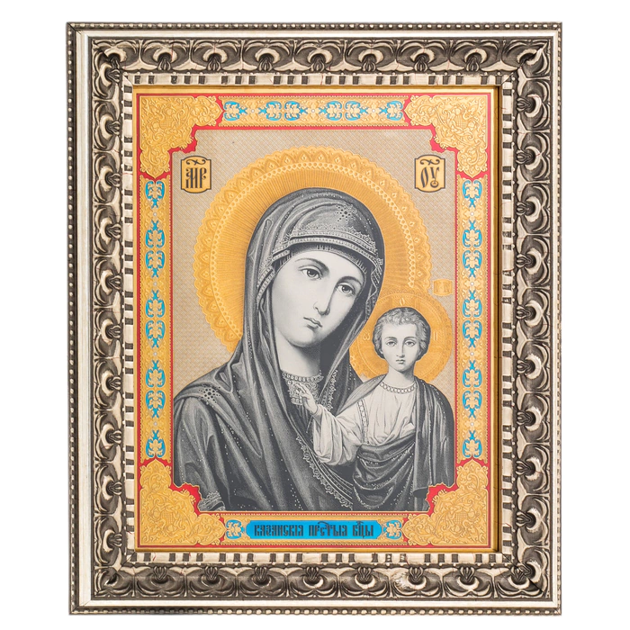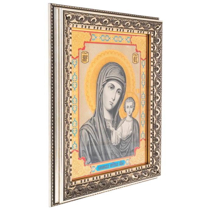 Икона «Божия Матерь Казанская» — один из самых почитаемых образов в православной традиции, воплощённый в крупном формате и выполненный с особой внимательностью к каноническим деталям и художественной выразительности. Лик Богородицы, обращённый к молящемуся, наполнен тихой сосредоточенностью и внутренней глубиной, а образ Младенца Христа, благословляющего правой рукой, усиливает ощущение духовной опоры и защиты. Композиция заключена в богатую декоративную раму, где сочетаются орнаментальные элементы, золочёные поля и цветовые акценты, придающие иконе торжественный и завершённый характер.
