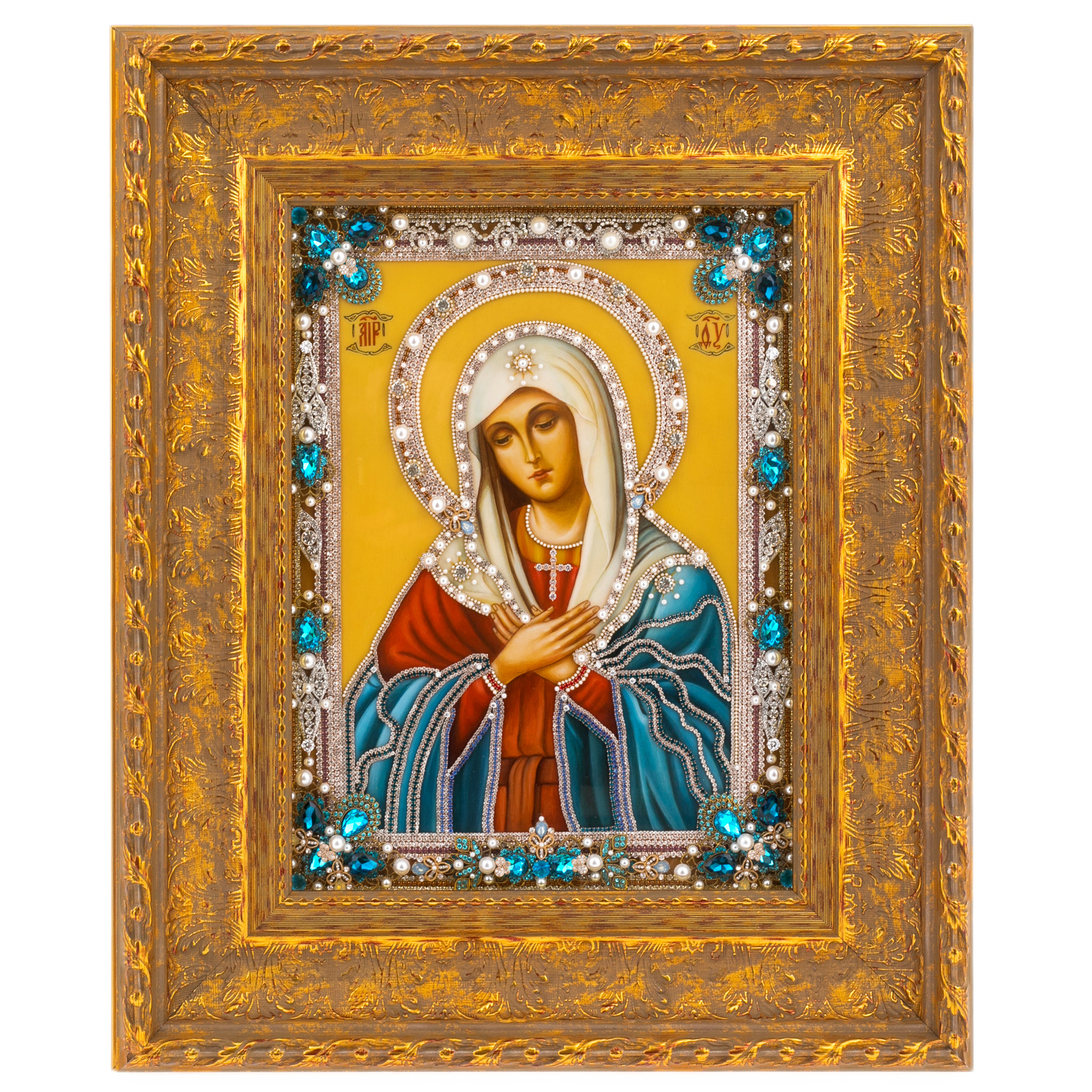 Рама словно обрамляет сияние, исходящее от образа. Каждый камень, будь то прозрачный хрусталь или насыщенный бирюзовый топаз, выбран с любовью и закреплен с филигранной точностью. Жемчуг, украшающий икону, напоминает о чистоте и божественном совершенстве, гармонично вписываясь в общий ансамбль. Россыпи сверкающих элементов создают ощущение небесного света, окружающего лик Богородицы.