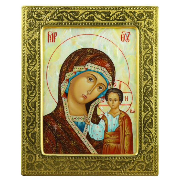Икона "Казанская Богоматерь" на натуральном перламутре в золотой раме
