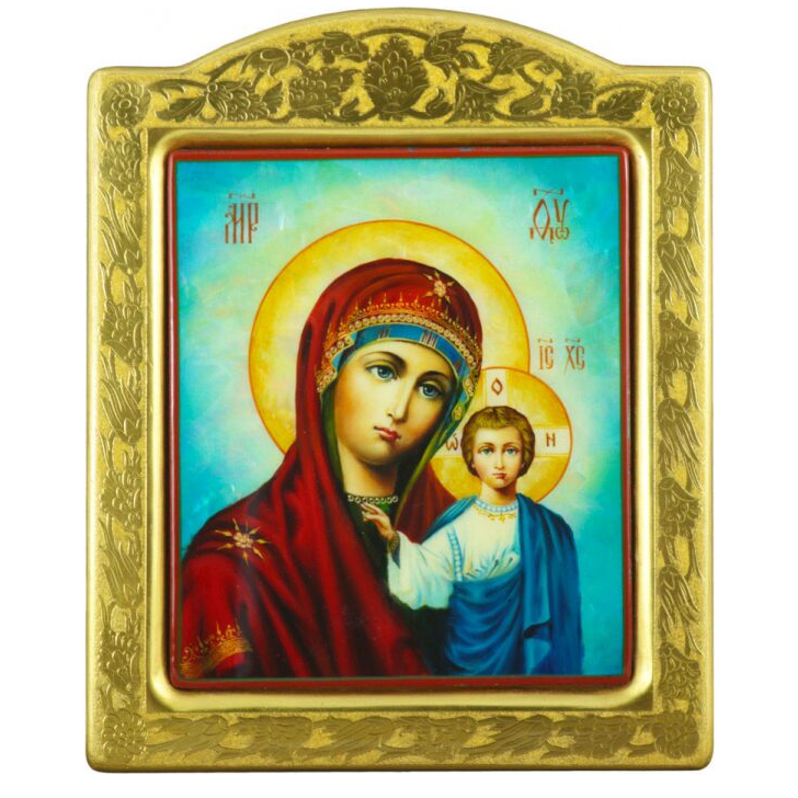 Икона с драгоценными камнями "Казанская Богоматерь" Икона с драгоценными камнями "Казанская Богоматерь" Икона выполнена методом термополиграфии и украшенная россыпью цветных декоративных камней, в частности жемчугом, цирконием и фианитами. Гармоничное сочетание цветов внутри композиции, сложная выкладка камней придают иконе особую выразительность. В работе над иконой мастер скрупулезно проработал все мельчайшие детали образа, что позволило создать великолепную, детализированную композицию. Икона оформлена в соответствии с православными канонами, в лучших традициях старинного иконописного искусства. Икона Казанской Божией Матери считается одной из самых почитаемых в православном мире. Пред иконой молятся о благополучии семьи, спасении. Иконой Казанской Божьей Матери благословляют будущую семейную пару к венцу. Пресвятая Богородица издревна прославлялась на Руси в многочисленных чудотворных образах. Но ни одна из икон не имеет такого количества списков, как Казанская. К ней чаще всего обращают взоры в бедах и болезнях, в честь этой иконы возведено множество храмов по всей России. Казанская икона Божией Матери явилась в городе Казани через 25 лет после покорения Казанского ханства царем Иоанном Грозным. Трудно шло дело проповеди веры среди мусульман и язычников. Пресвятая Богородица, не замедлила послать проповедникам Небесную помощь, явив Свою чудотворную икону. 28 июня 1579 года страшный пожар истребил часть города и обратил в пепел половину Казанского Кремля. Пожар в Казани явился предзнаменованием окончательного падения ислама и утверждения Православия на всей златоордынской земле. Город вскоре начал вставать из руин. Девятилетней дочери стрельца Данила Онучина в сонном видении явилась Божия Матерь и повелела достать Ее икону, зарытую в землю тайными исповедниками Православия ещё при господстве мусульман. В итоге икону обрели, и на место чудесного обретения прибыл архиепископ Иеремия и перенес образ в ближайший храм, откуда, после молебна, икону с Крестным ходом перенесли в Благовещенский собор. Вскоре икона стала всенародной святыней, знамением Небесного покрова Божией Матери, явленного всей Русской Церкви. За несколько десятков лет русские землепроходцы - миссионеры прошли на восток многие тысячи километров и в 1639 году вышли в первое плавание.