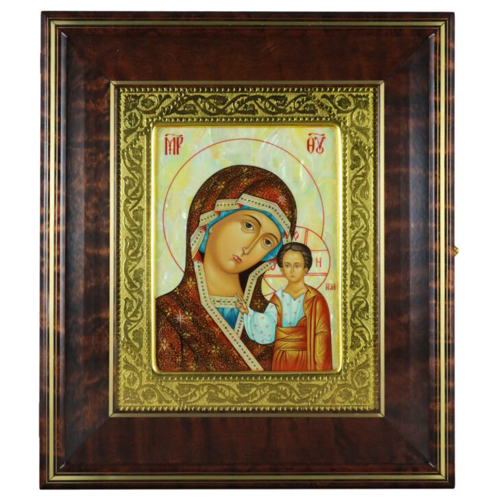 Икона "Казанская Богоматерь" в киоте и золотой раме на натуральном перламутре