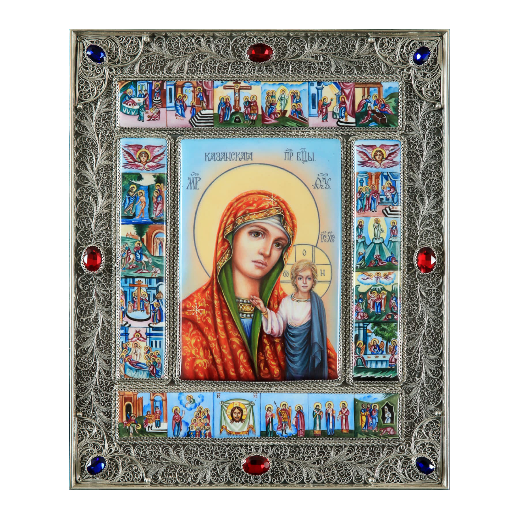 Икона Богоматерь Казанская - это великолепное произведение русского искусства, созданное с использованием высококачественных материалов. На этой иконе изображена Пресвятая Богородица, обрамленная богатой декоративной отделкой: филигранью, горячей эмалью, драгоценными камнями и серебром.