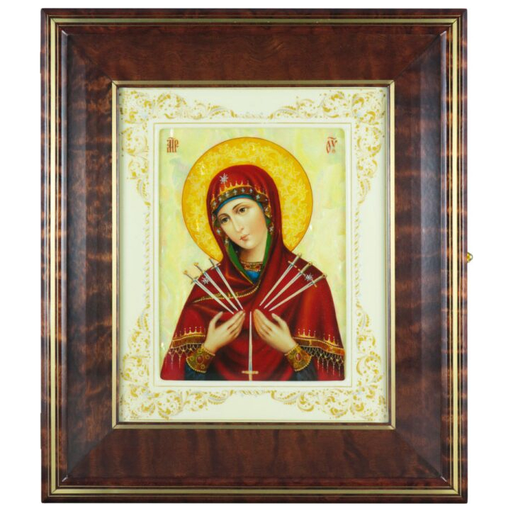 Икона "Богоматерь Умягчение злых сердец" в белой раме и киоте на натуральном перламутре
