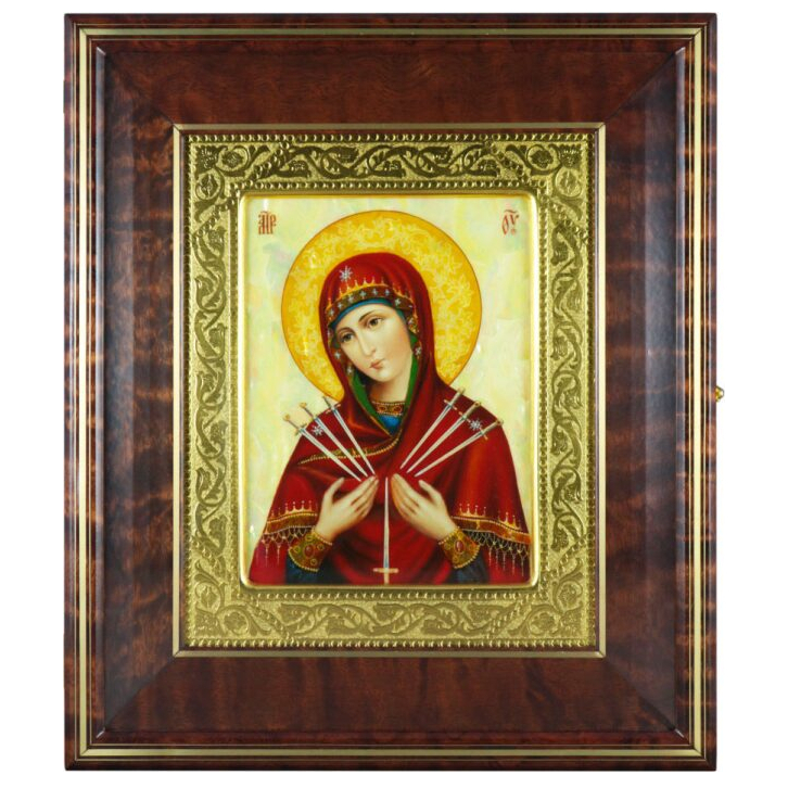 Икона "Богоматерь Умягчение злых сердец" в киоте и золотой раме на натуральном перламутре