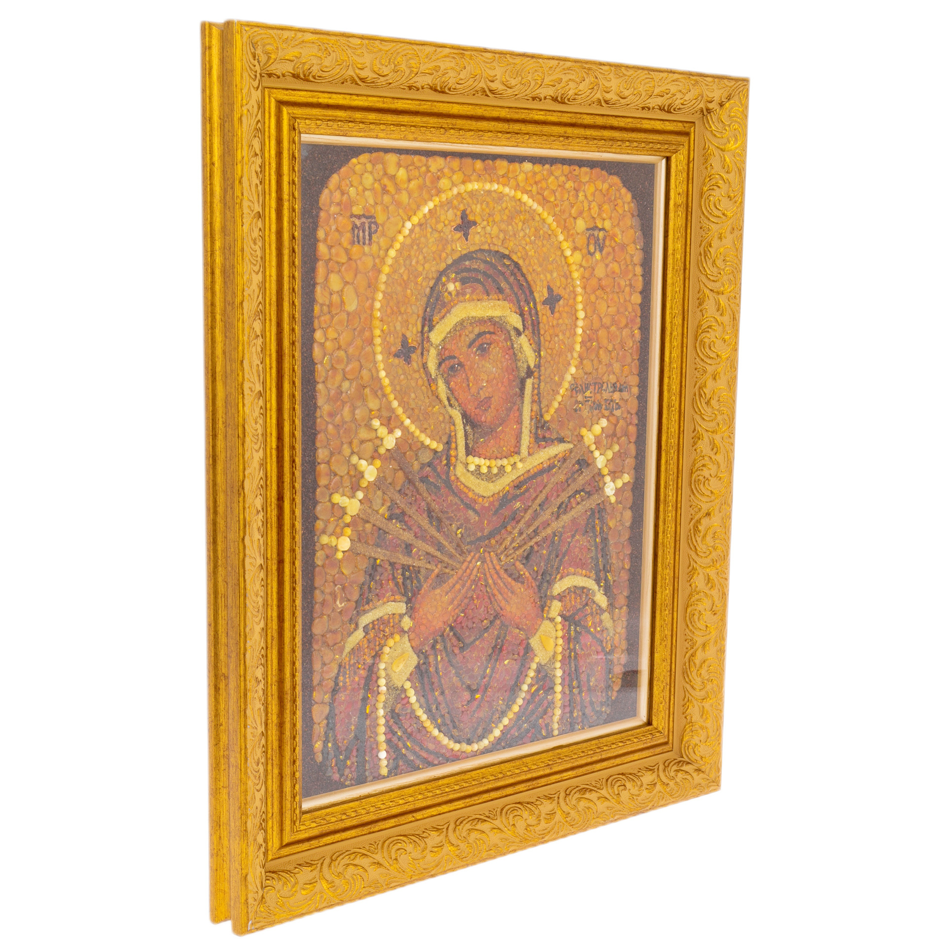 Икона из янтарной мозаики «Семистрельная» выполнена в изысканной технике, сочетающей светоносные оттенки природного янтаря и филигранную работу мастера. Образ Богородицы с семью стрелами, пронзающими сердце, символизирует духовное очищение через страдания и милосердие, обращая взор верующего к идеям терпения и прощения.