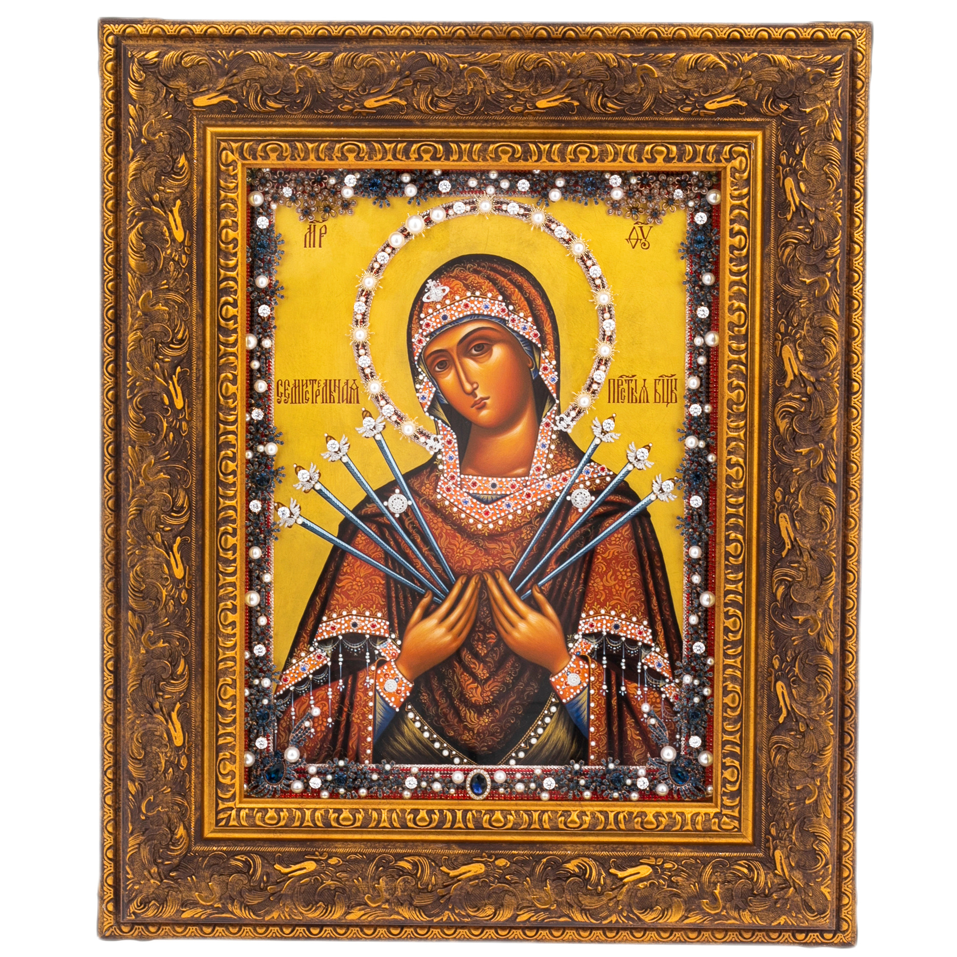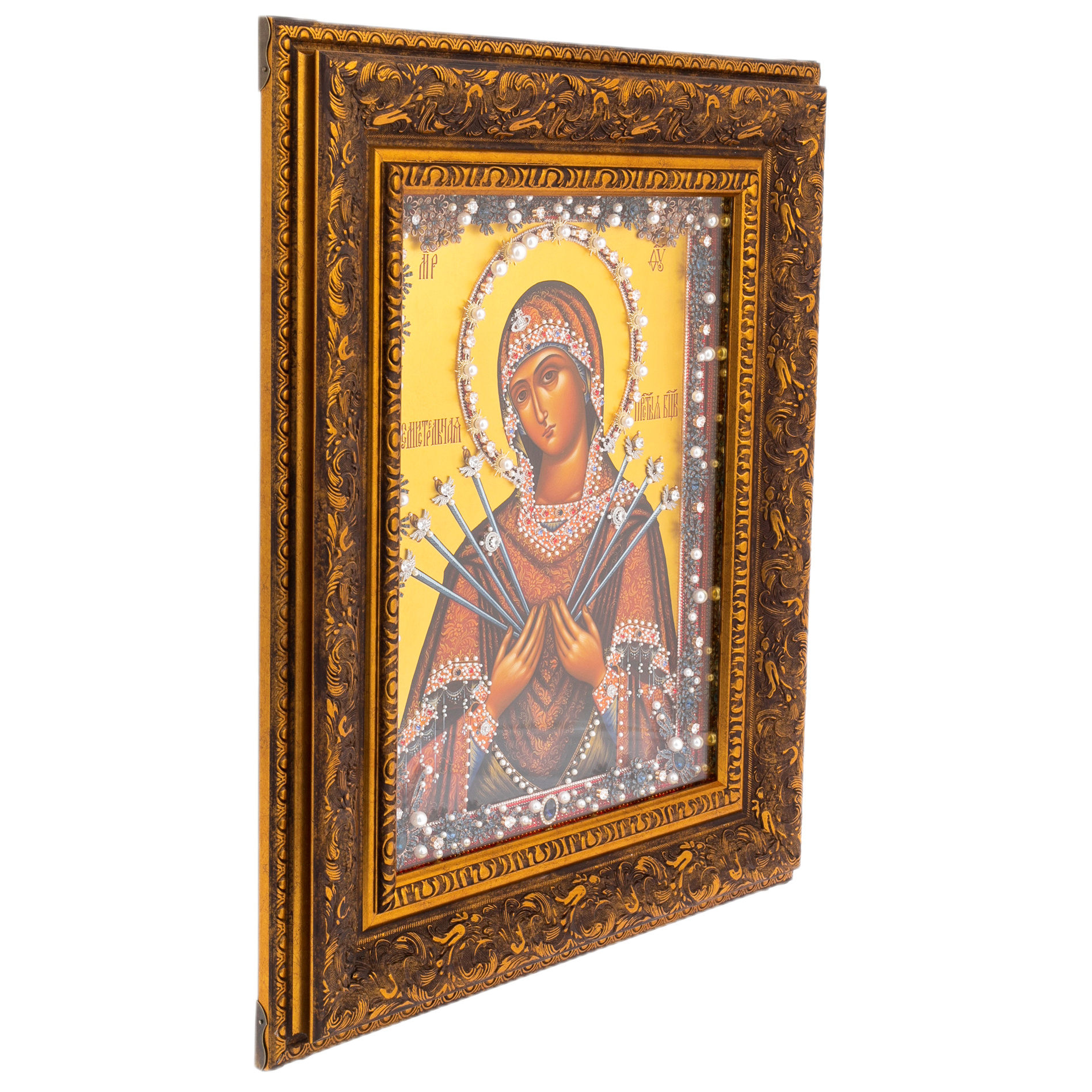 Икона Божией Матери «Семистрельная» с масляной росписью и сусальным золочением — образ великой скорби, милосердия и заступничества. Богородица изображена с семью мечами, пронзающими сердце — символами страданий, пережитых Ею во имя любви и спасения человечества. Взгляд Девы проникновенный, исполненный тихой скорби и одновременно внутренней силы. Каждый штрих написан с иконописной точностью, сохраняя каноничность образа и передавая эмоциональную глубину. Ореол, отделанный сверкающими декоративными элементами и жемчужными вставками, словно излучает свет благодати.