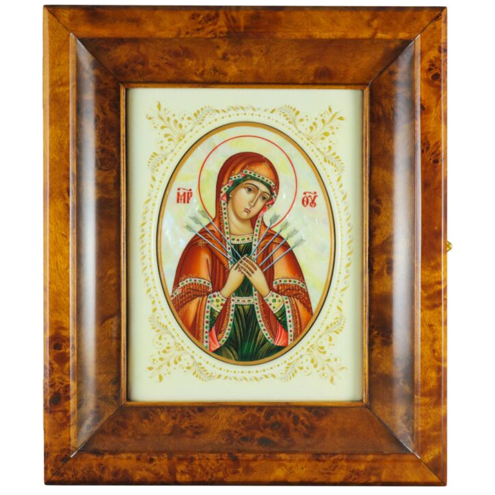 Икона на натуральном перламутре "Семистрельная Богоматерь" в белой раме и киоте