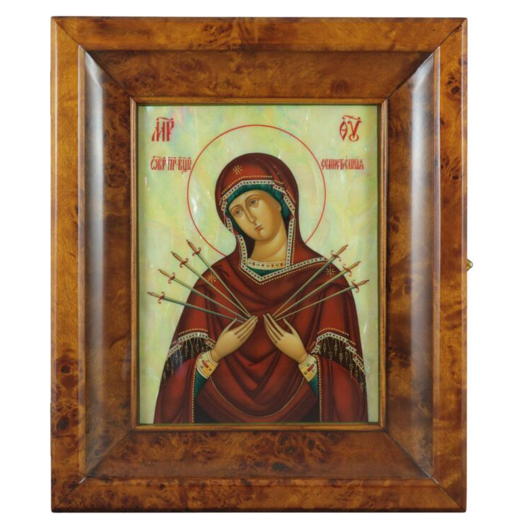 Икона на натуральном перламутре "Семистрельная Богоматерь" в киоте