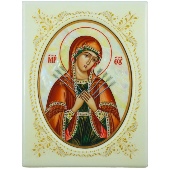Икона с перламутром "Семистрельная Богоматерь" в белой раме