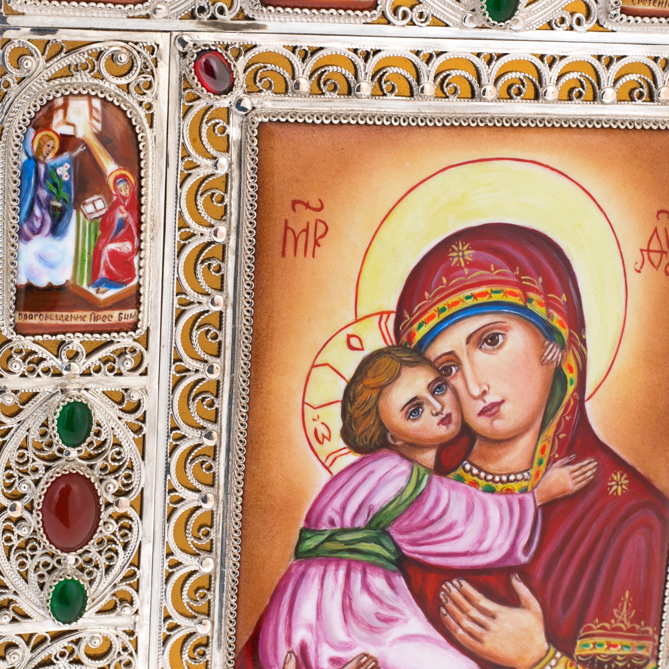 Икона Божьей Матери Владимирская из серебра — подлинное воплощение высокого искусства, рожденного на пересечении благоговейной веры и ювелирного мастерства. Этот уникальный образ, выполненный с использованием техники финифти, хранит в себе особое тепло и свет, способные проникнуть в глубину человеческой души. Финифть — древнейшее искусство миниатюрной живописи, процесс создания которой невероятно сложен. Над каждым произведением трудятся лучшие мастера-живописцы, чьи работы признаны ценителями искусства по всему миру. Роспись по эмали сохраняет чистоту, блеск и прозрачность цвета практически вечно, и такие изделия можно встретить в крупнейших музеях, включая Музей народного искусства в Москве, Государственный Исторический музей и Государственный Русский музей.