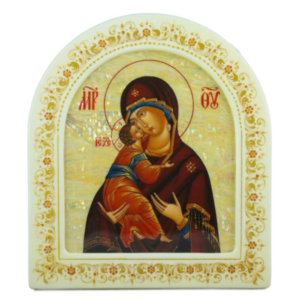 Икона с перламутром "Владимирская Богоматерь" в белой раме (арка)