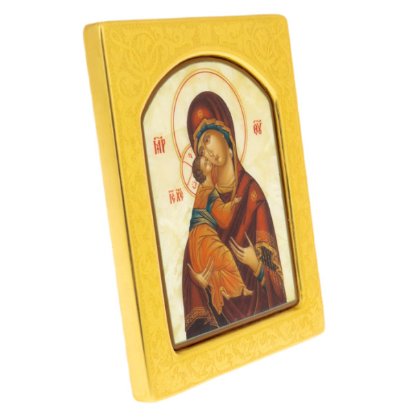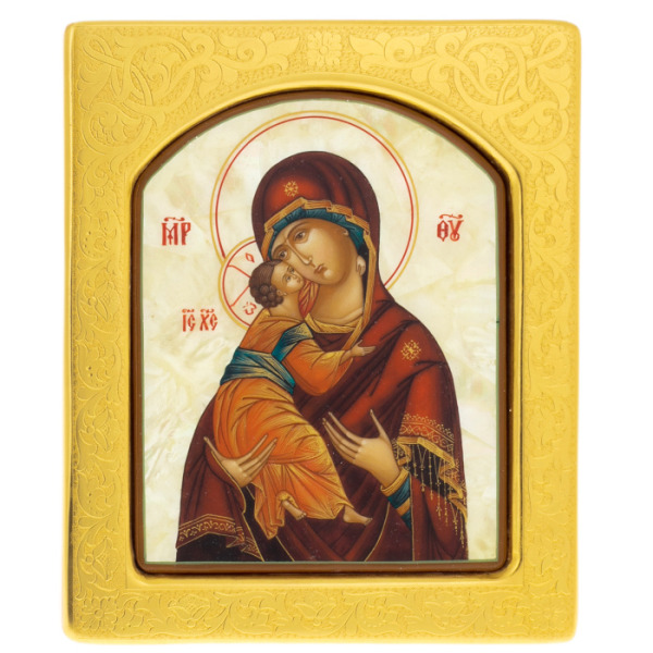 Икона с перламутром "Владимирская Богоматерь" в золотой раме с чеканкой