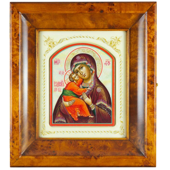 Икона в белой раме и киоте "Владимирская Богоматерь" на натуральном перламутре