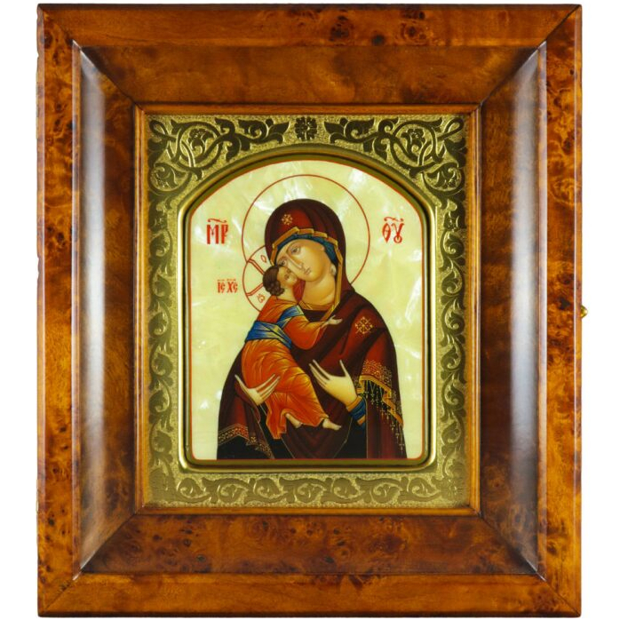 Икона в золотой раме и киоте "Владимирская Богоматерь" на натуральном перламутре