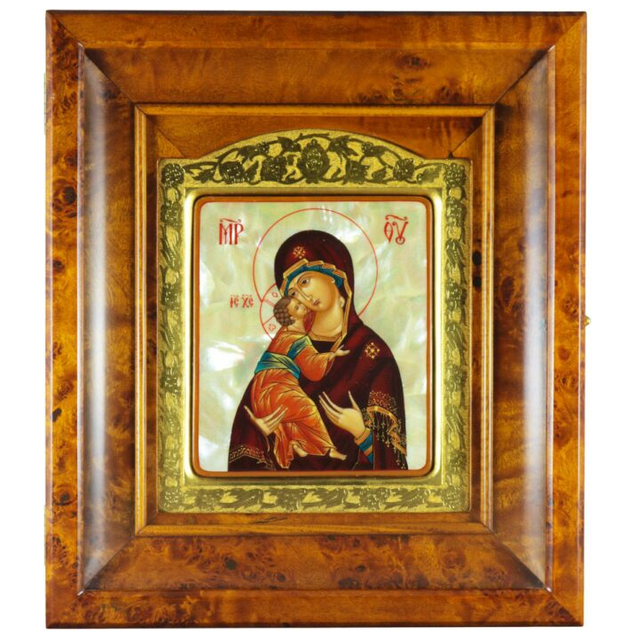 Икона "Владимирская Богоматерь" в золотой раме и киоте на натуральном перламутре