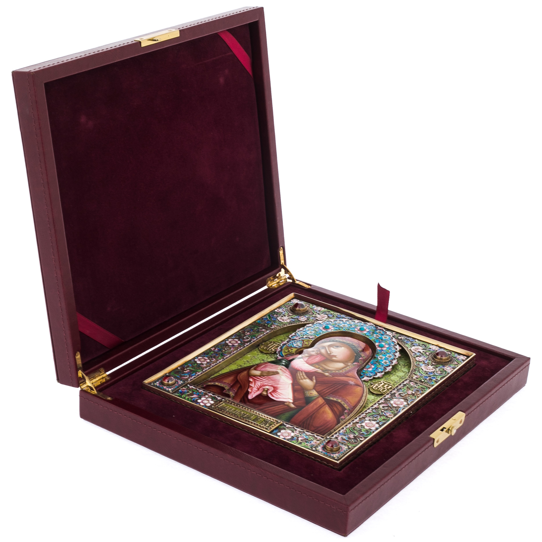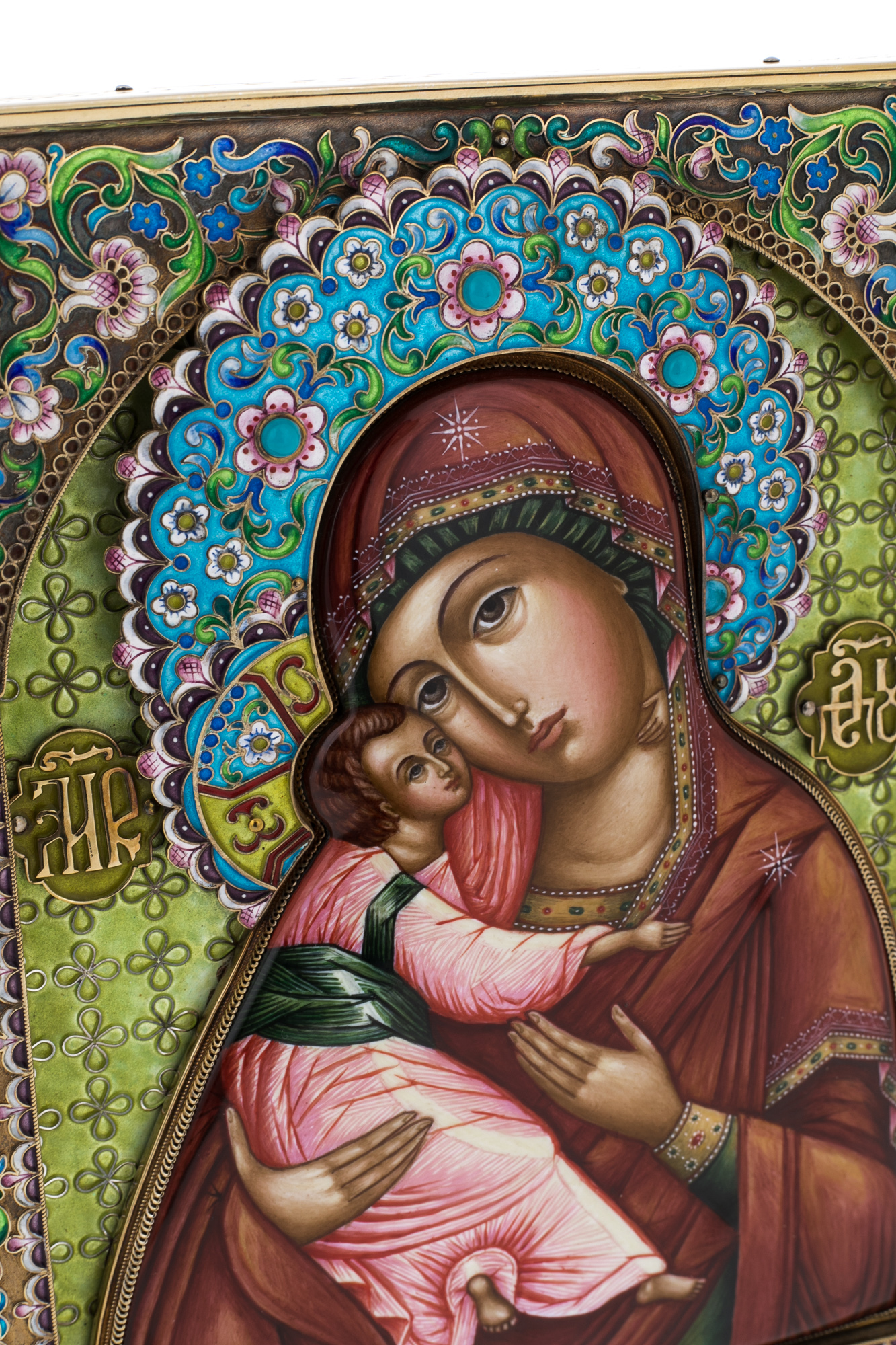 Эта икона Владимирской Божьей Матери — истинный образец высочайшего ювелирного искусства и духовного наследия. В её взгляде и каждом мазке финифти заключены особые сила и нежность, способные проникнуть в самое сердце. Пресвятая Богородица, изображенная с младенцем на руках, словно приглашает нас заглянуть в бесконечную глубину материнской любви, где каждый взгляд и жест передают покой, уверенность и защиту.