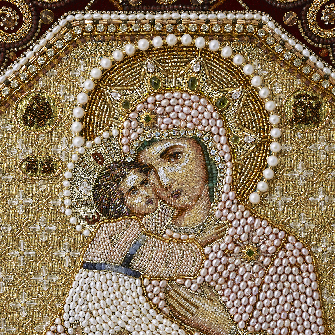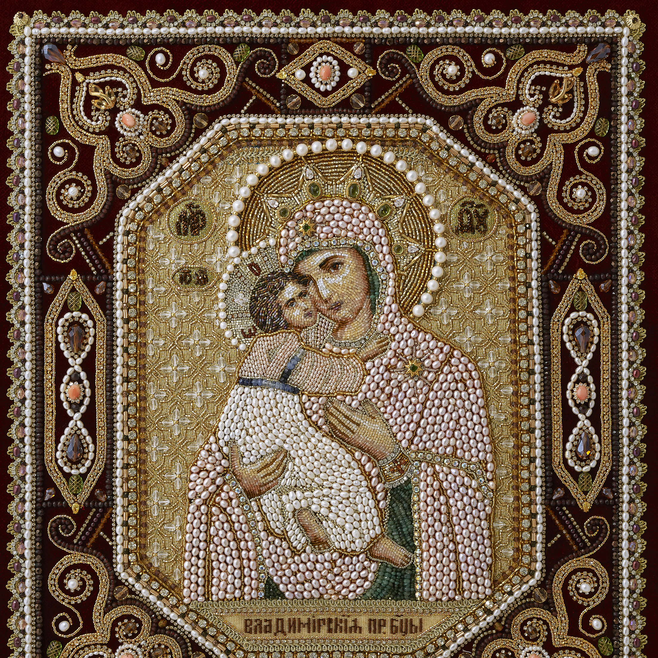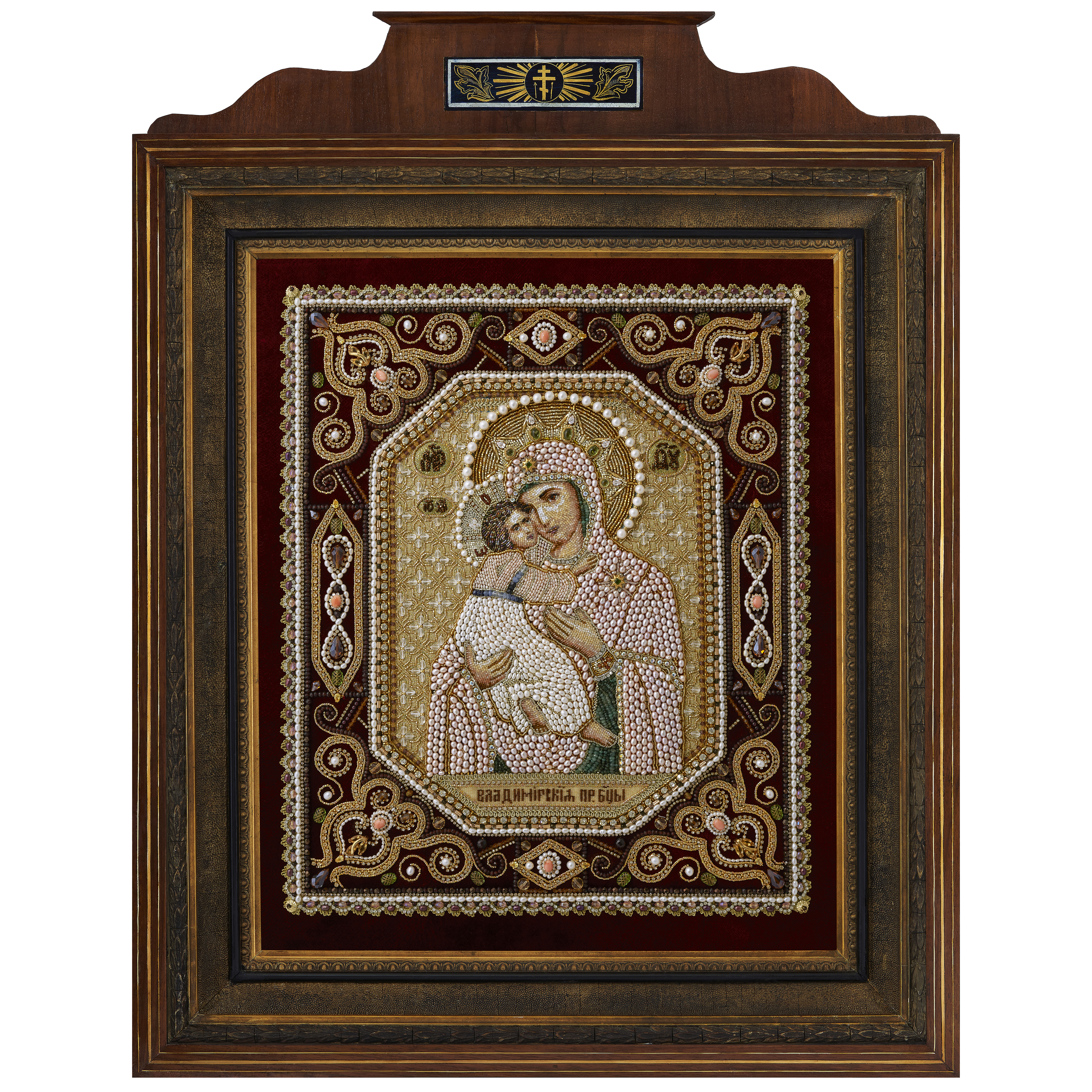 Вышитая икона "Богоматерь Владимирская" в раме и киоте