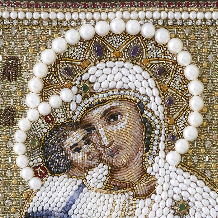 Лик Богоматери, выполненный в технике мозаичного шитья стеклянной рубкой, буквально оживает под лучами света. Каждый стежок, каждая бисеринка объединяются в гармоничную симфонию света и тени, создавая эффект, сравнимый с классической живописью. Это искусство "живописи иглой" превращает икону в настоящее сокровище, достойное восхищения и преклонения.