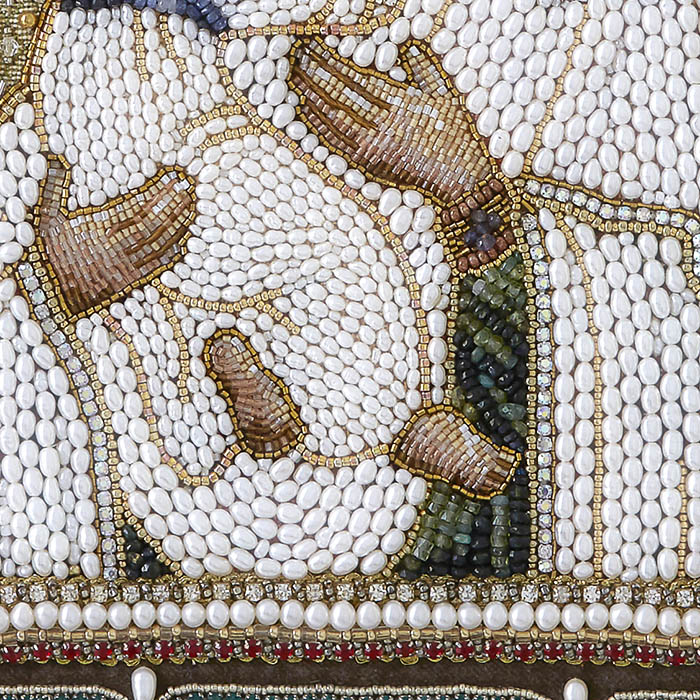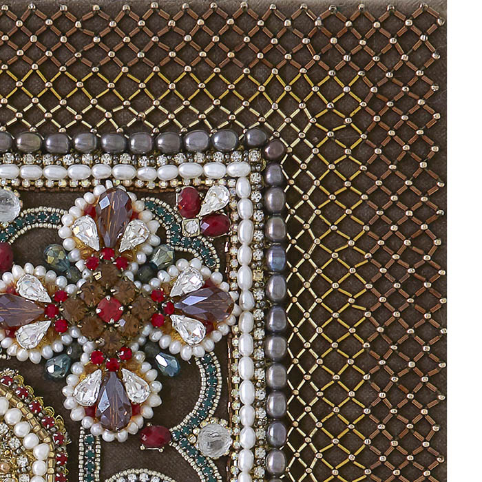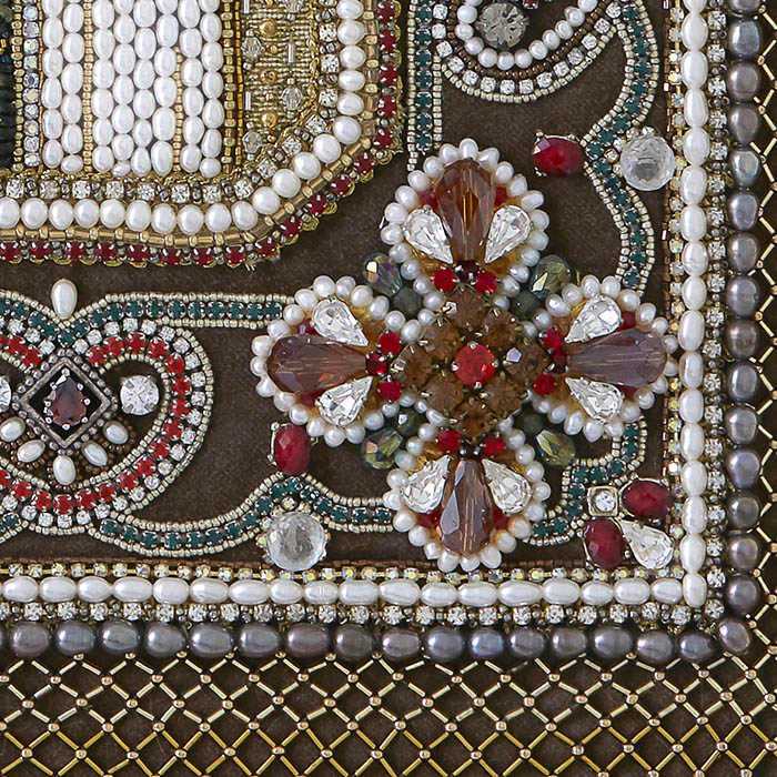 Нимб, сияющий золотыми нитями и жемчугом, окружает её лик, символизируя божественный свет, пронизывающий мир. Бархат глубокого коричневого оттенка служит идеальным фоном для изысканного орнамента из гранатов, сапфиров, розового кварца, турмалина, аметистов и хризопраза. Каждая деталь орнамента, будь то сверкающий хрусталь или утончённый японский бисер, подчёркивает величие образа и мастерство создателей.