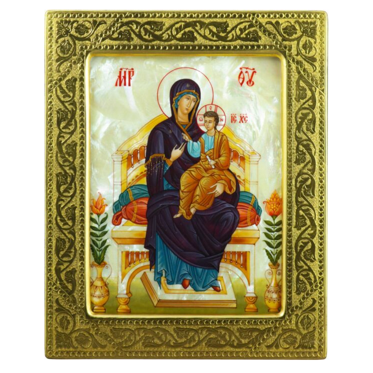 Икона "Богоматерь на престоле" на натуральном перламутре в золотой раме