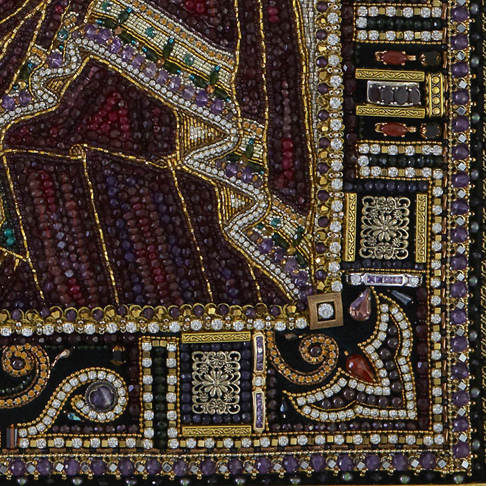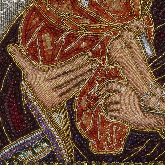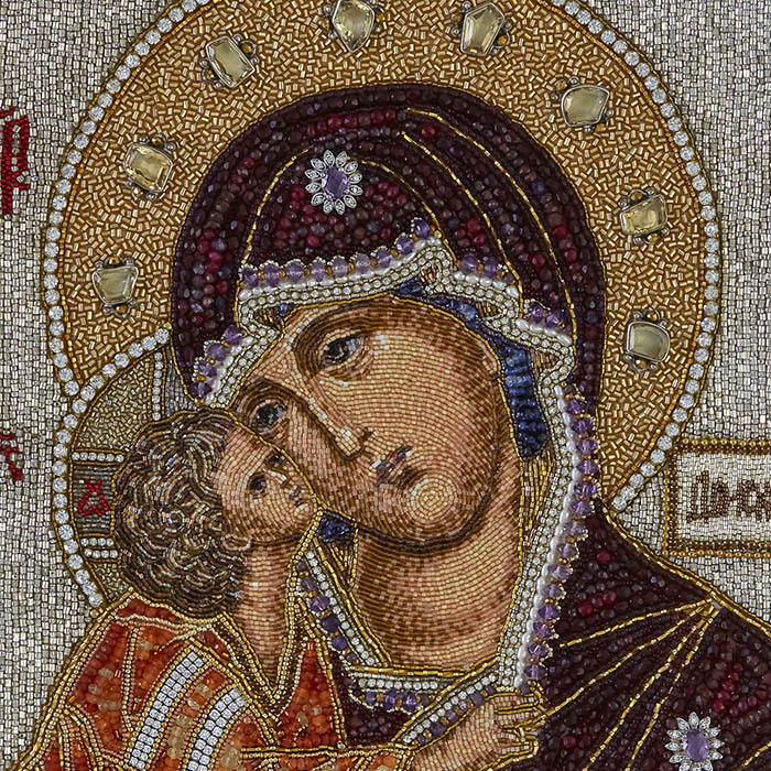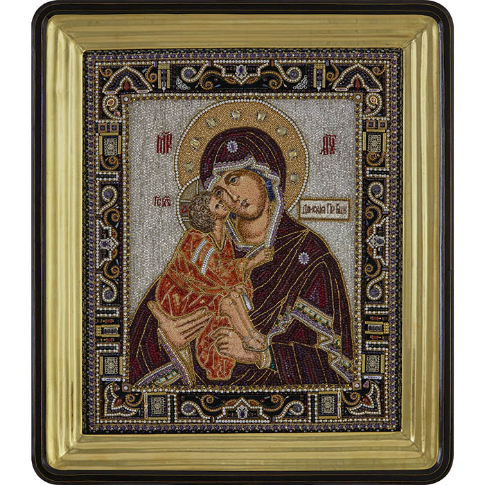 Вышитая икона "Богоматерь Донская" в антикварной раме и киоте