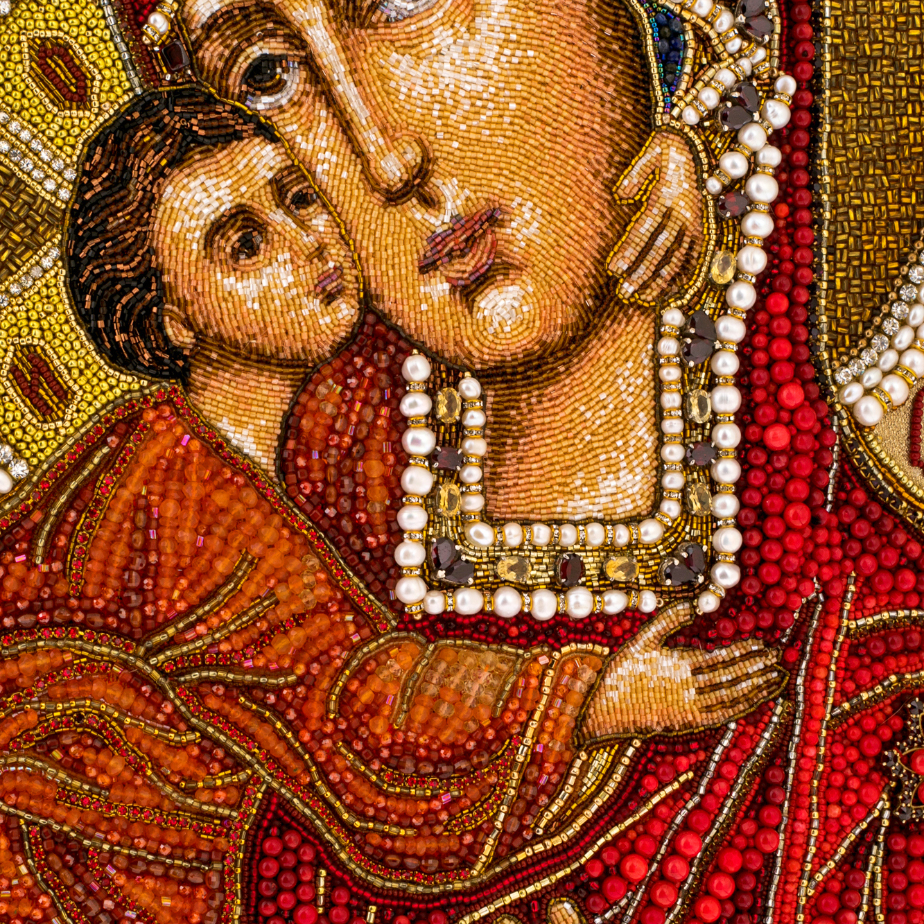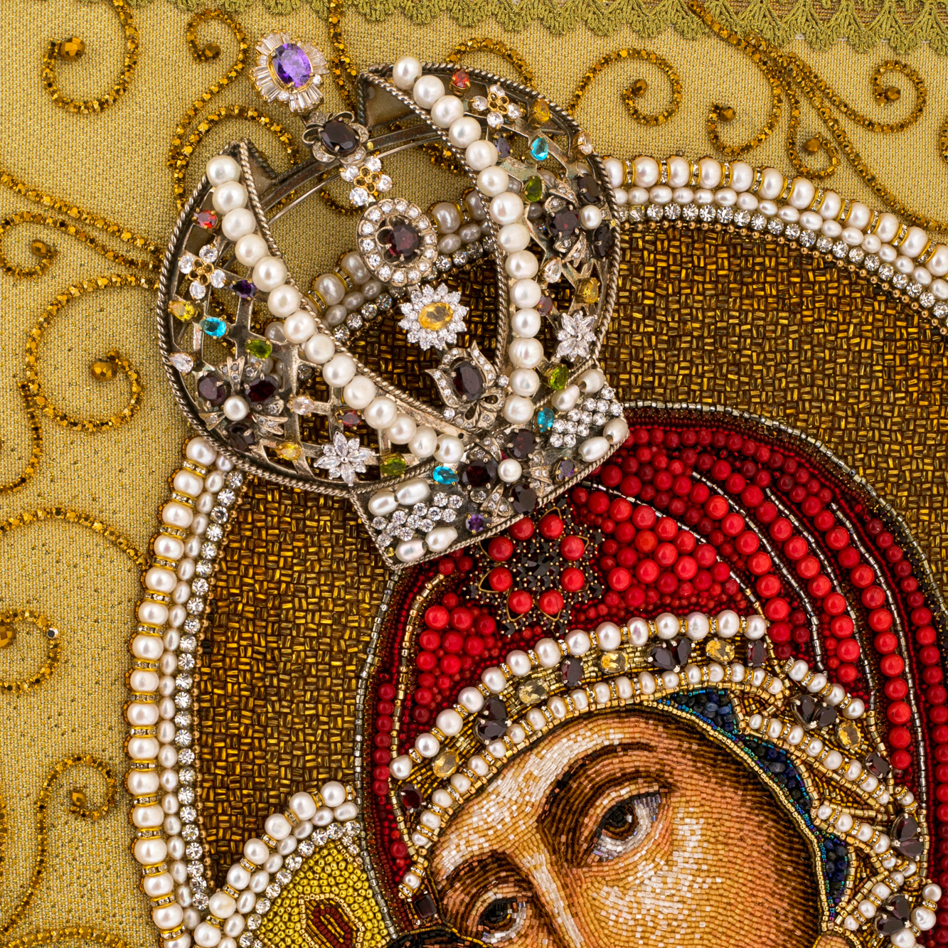 Лик Богородицы, окаймлённый тысячами мельчайших бисерин и натуральным жемчугом, излучает умиротворение и величие. Ручная вышивка, выполненная в старинной технике, рождает ощущение живого дыхания на ткани, где каждый стежок шепчет о терпении и молитвенном труде мастера. Венчает икону корона, усыпанная разноцветными камнями — как символ Царицы Небесной и её неугасимого света, пробивающегося сквозь тёмные времена.