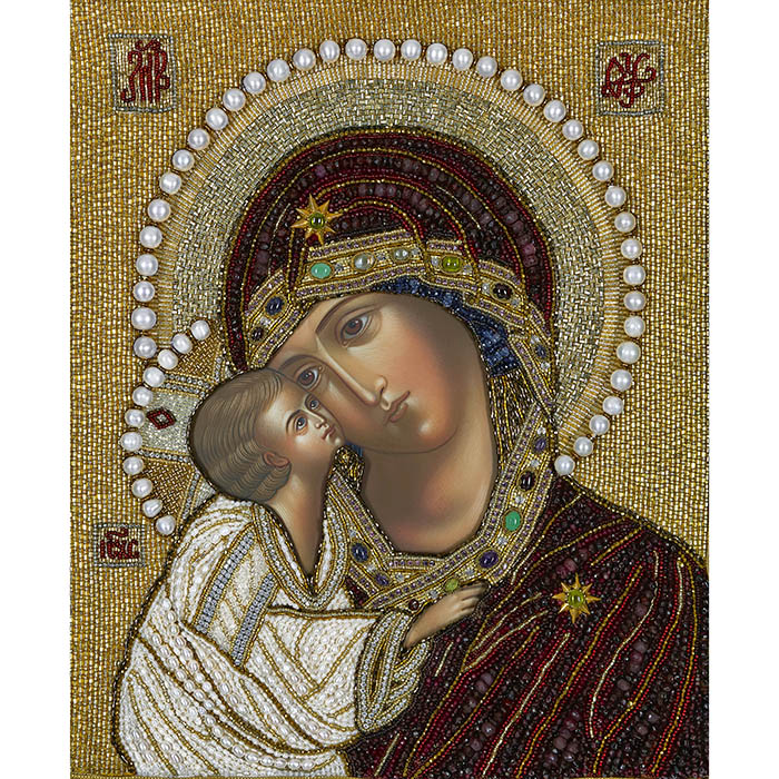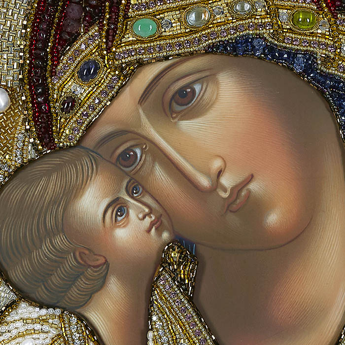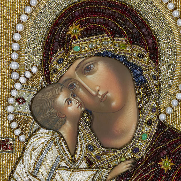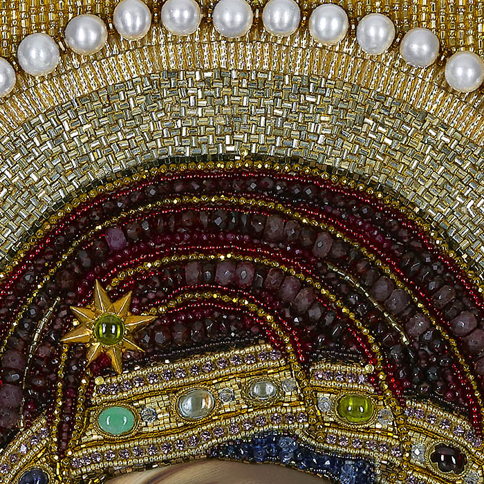 Роскошная отделка иконы раскрывает её глубокий символизм. В сияющем нимбе, расшитом вручную, использованы жемчуг, хрусталь и драгоценные камни — топазы, рубины, турмалины, изумруды, гранаты, шпинели, аметисты, хризолиты и хризопразы. Они, словно звёзды, озаряют золотую канву, создавая эффект живого света, исходящего от самого образа. Каждая деталь, от мелких бисерин до ярких страз, акцентирует внимание на божественном величии иконописного искусства.