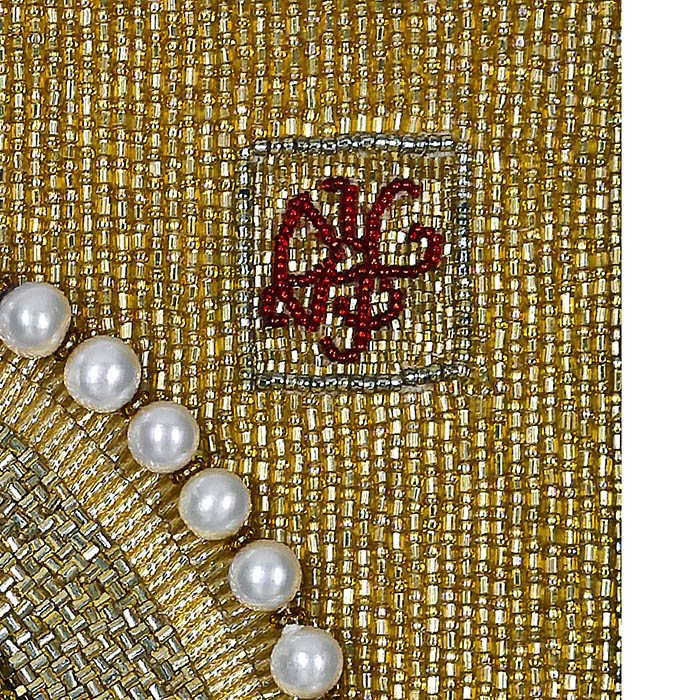 Золотое сияние дополнено серебряными элементами и богатством красного и бордового оттенков, подчёркивающих драматизм и глубину образа. Орнаментальная отделка, выполненная из японского и чешского бисера, обрамляет икону, придавая ей величие и торжественность.
