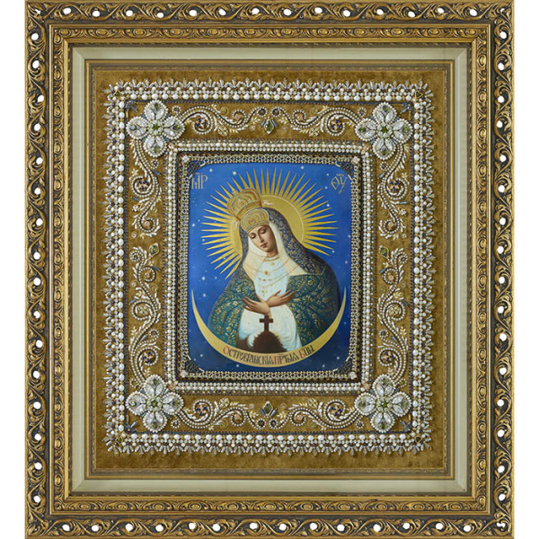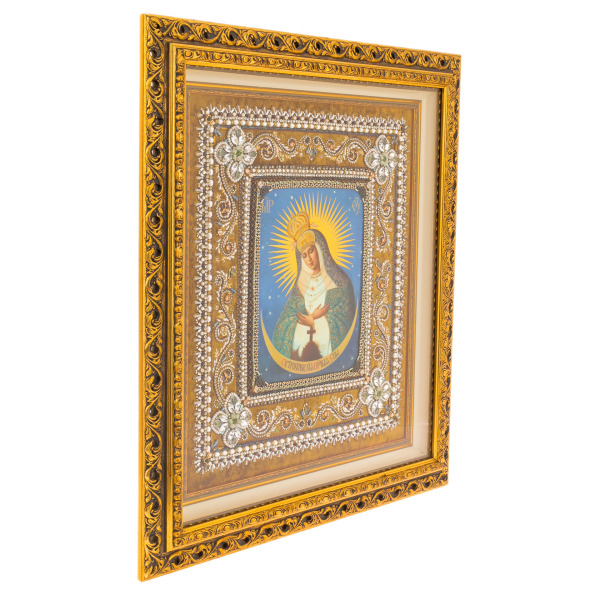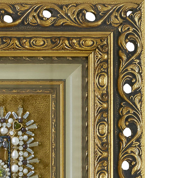 Рама, обрамляющая икону, — это произведение искусства, созданное из позолоченного дерева. Резьба и орнаменты рамы подчёркивают величественность образа, словно приглашают зрителя заглянуть за грань мирского и прикоснуться к высшему. Виньетки из жемчуга, кристаллов и сияющих стразов формируют замысловатые узоры, перекликающиеся с небесным светом на иконе.