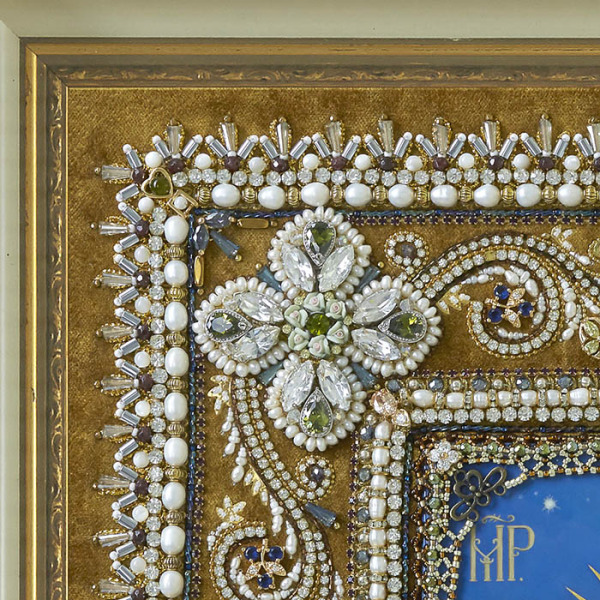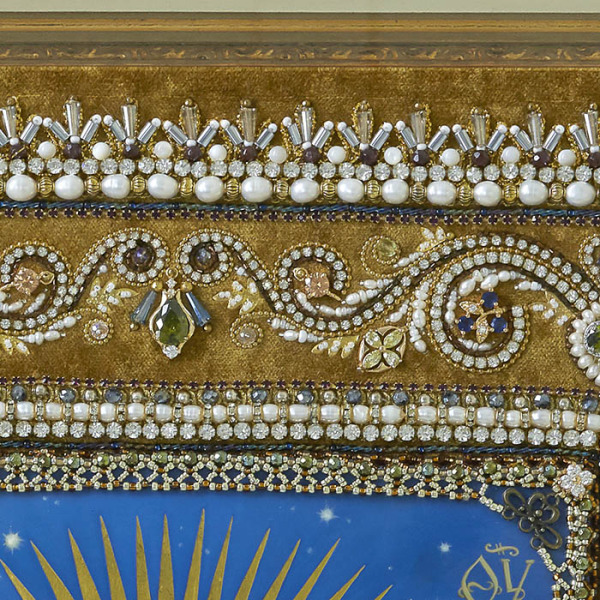 Главный акцент образа — лик Богородицы, окружённый сиянием золотого ореола, олицетворяющего святость и вечный свет истины. Её мягкий взор и сложенные руки передают чувство безмолвной молитвы и глубокого благоговения. Сложный узор на покровах, выполненный в изысканных тонах синего и зелёного, украшен изящной ручной вышивкой, драгоценными камнями и хрустальными элементами. Каждый стежок, каждый перелив света на тканях и камнях создает ощущение гармонии и совершенства.