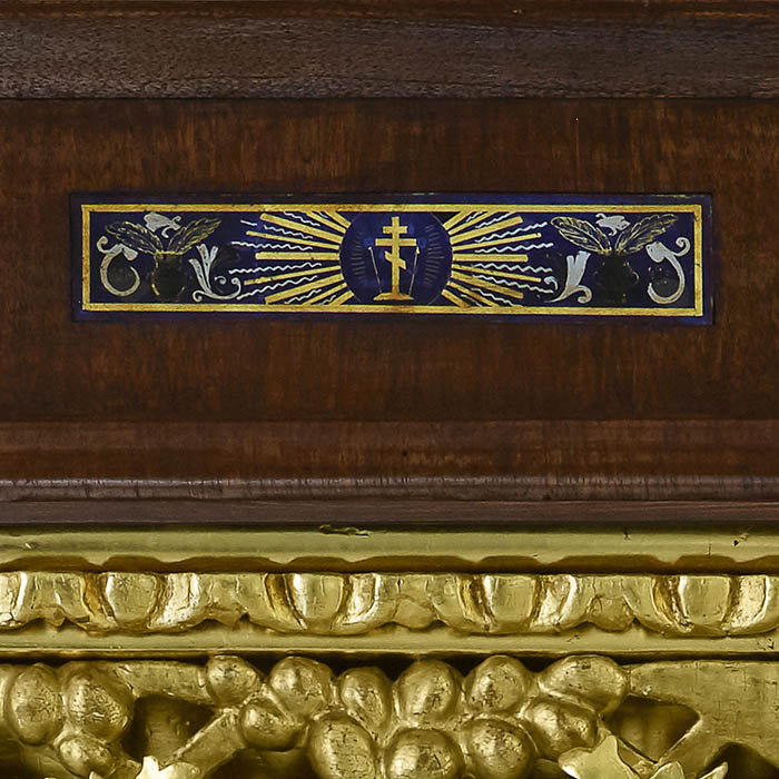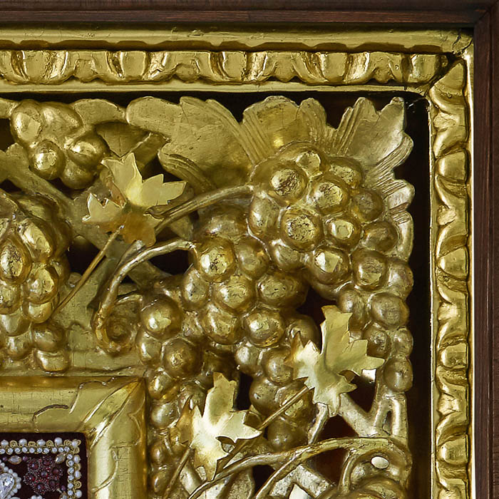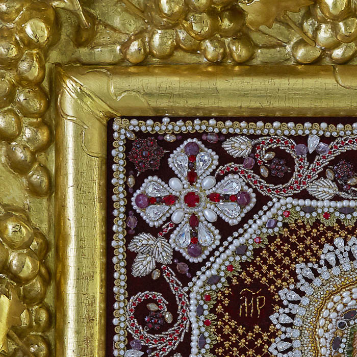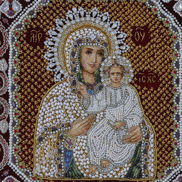 Икона «Богоматерь Смоленская» считается покровительницей путешественников и защитницей от врагов; к ней обращаются с молитвами о благополучном пути, сохранении семьи, защите Отечества, избавлении от бедствий и помощи в преодолении жизненных трудностей. Техника: Лицевое мозаичное и орнаментальное шитье; ручная вышивка; шитье драгоценными камнями и жемчугом в прикреп. Материалы: звездчатый рубин, сапфир, турмалин, розовый и зеленый цитрин, гранат альмандин, гранат пироп, гидрогроссуляр, сард, кварц, хрусталь, жемчуг, стразы, бисер (Чехия, Япония), металл. Рама (резная, составная): шпон, дерево; резьба, золочение. Киот: дерево, стекло; резьба, золочение; навершие с декор. вставкой (стекло). Реставрация рамы и киота: стекло, шпон, золото сусальное, канифоль, морилка; дорезка, доборка, резьба, золочение.