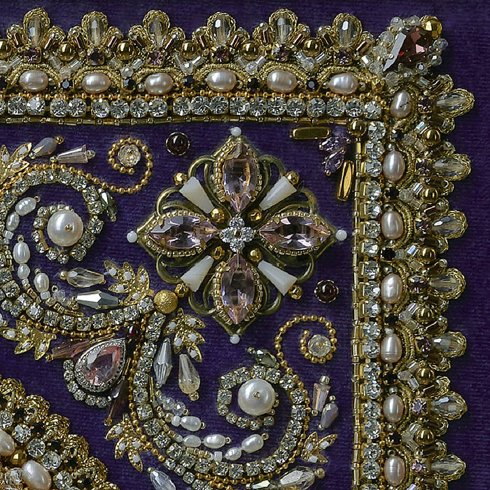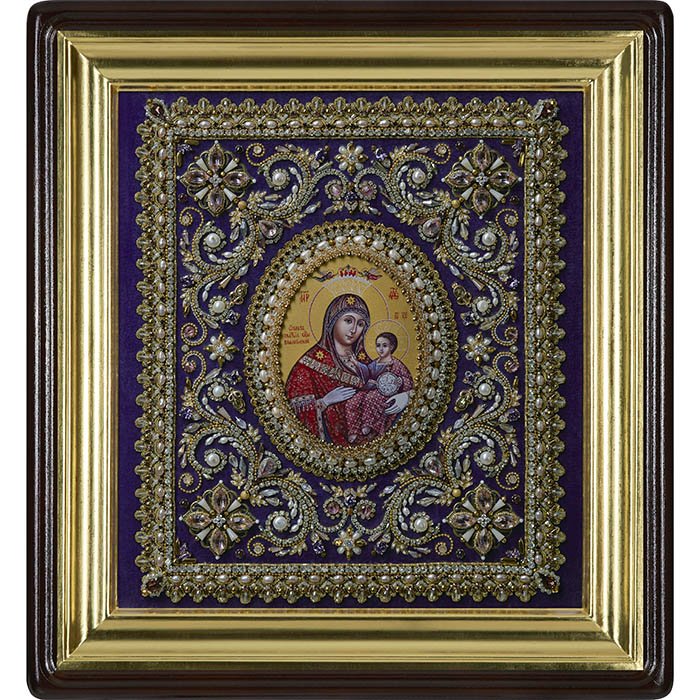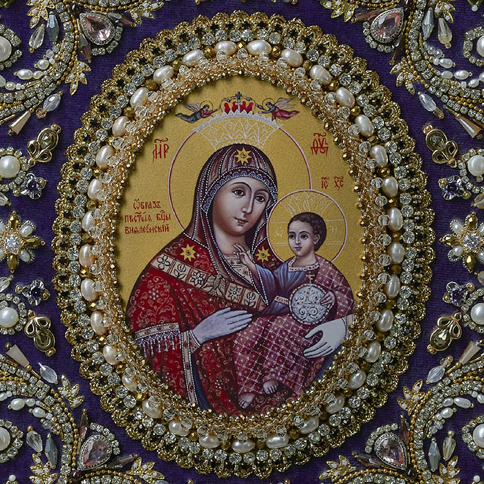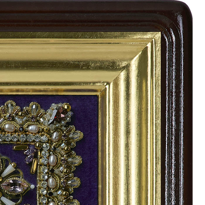 Роскошное обрамление образа выполнено из лучших материалов, которые подчёркивают величие иконы. Глубокий фиолетовый бархат фона служит достойной основой для филигранного орнамента из розового аметиста, граната, жемчуга и хрусталя. Золотные нити, вплетённые в ткань, добавляют сияние, словно отражая небесный свет, исходящий от самого образа. Украшения из японского и чешского бисера создают сложные узоры, в которых каждая деталь имеет своё значение, подчеркивая мастерство создателей.
