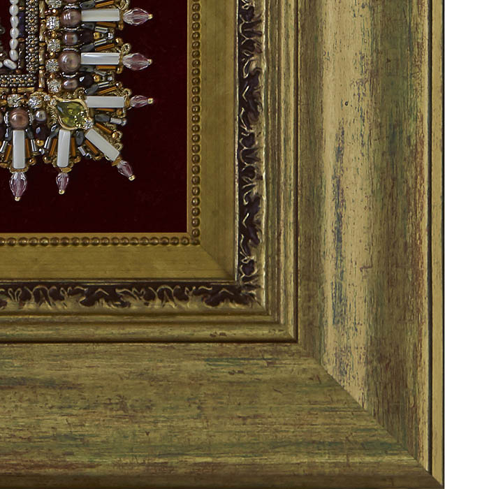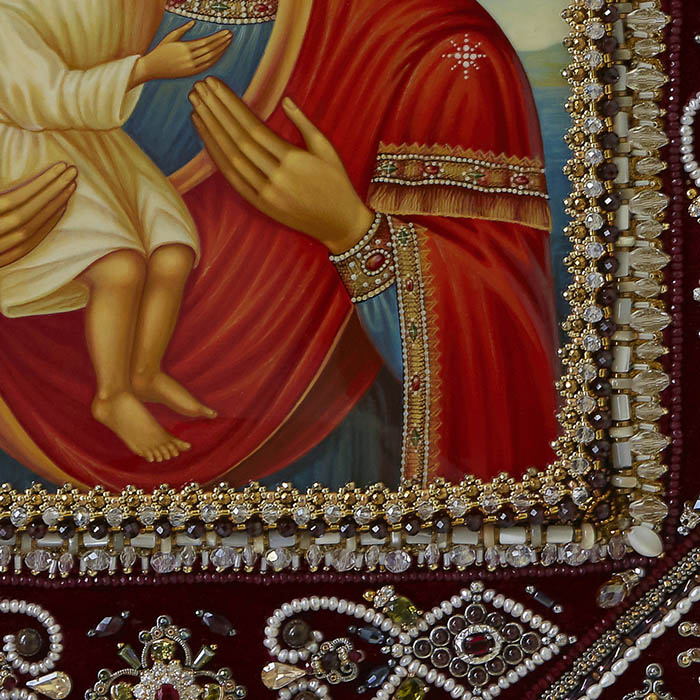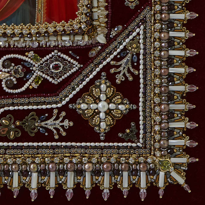 Вокруг образа орнаментальное шитье разворачивается как сияющая мандорла — сплетение золотных нитей и драгоценных камней. Гранаты, подобно каплям крови, символизируют страдания и искупление, тигровый глаз переливается тёплыми оттенками верности и защиты, а цирконы и хрусталь светятся холодным блеском вечности, обрамляя лики небесной славой. Искрящиеся бисер и жемчуг, вручную вплетенные в благородный бархат, напоминают росу на лепестках цветов, что подчеркивает живость и утонченность каждого элемента.