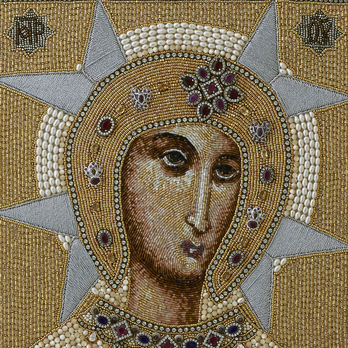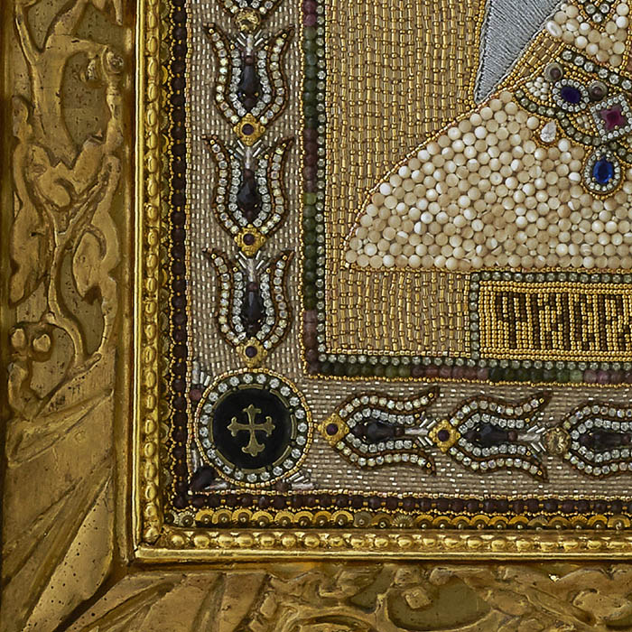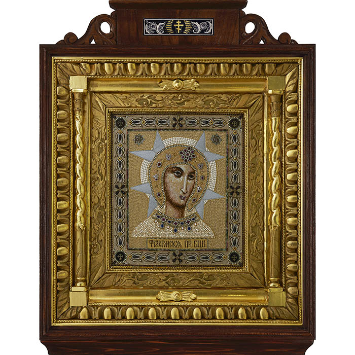 Вышитая икона "Богородица Филермская" в антикварной раме и киоте