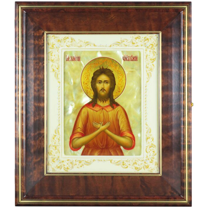Икона "Алексий человек Божий" в белой раме и киоте на натуральном перламутре