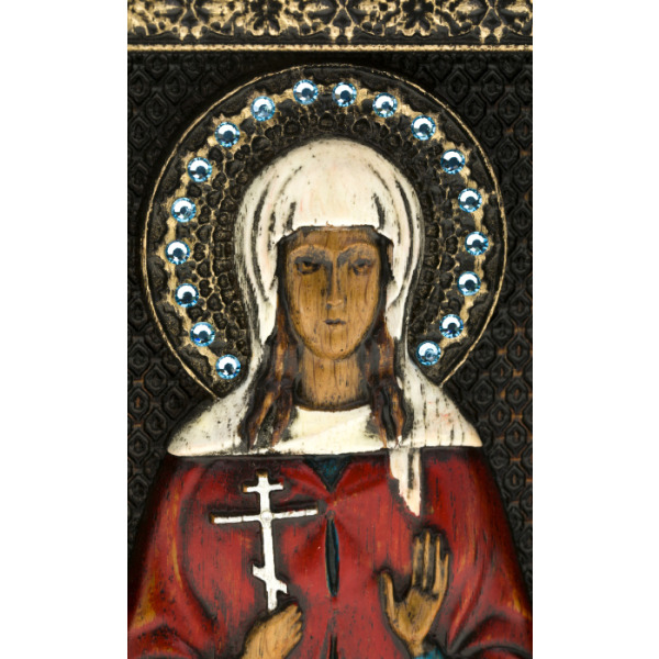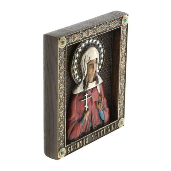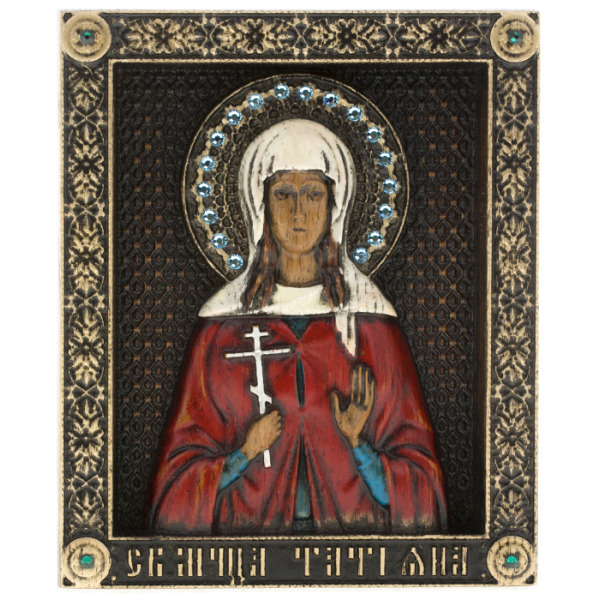 Икона с драгоценными камнями "Святая Татьяна"Икона с драгоценными камнями "Святая Татьяна"Икона выполнена вручную из красивых,дорогих материалов с соблюдением всех древних иконописных традиций. Для создания иконы художник использовал муранское стекло,хрусталь , фианиты, серебро и натуральное дерево. Лик святой и фоновая картина выложены из мельчайших частиц – разноцветных камней. Мастер скрупулезно проработал каждую деталь, что позволило придать работе особую выразительность и яркость. Дополняет роскошную икону из камней и стекла элегантный узорный оклад натурального дерева.