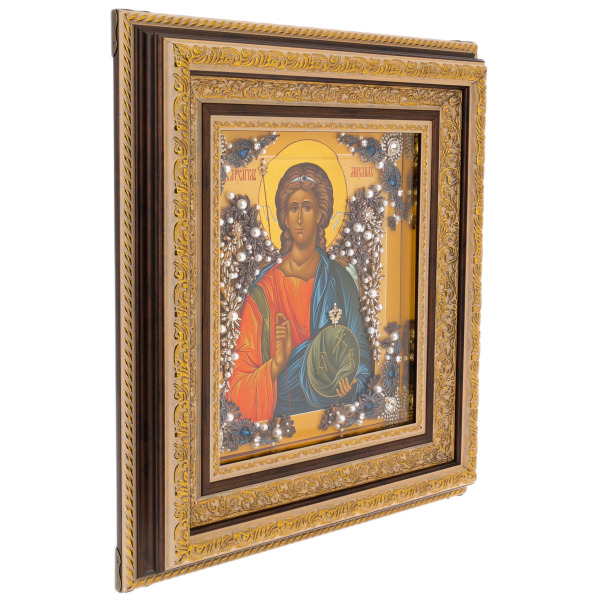 Искусное обрамление иконы украшено сложными узорами, инкрустированными жемчугом и сверкающими кристаллами Swarovski, которые словно небесные звёзды, подчеркивают божественную природу образа. Ветви, усеянные драгоценными камнями, окружают лик святого, создавая атмосферу небесного света и благодати, исходящей от иконы. Каждая деталь здесь несет в себе символизм и значимость — от переливов сусального золота до точности прорисовки одежды, где тёплые оттенки красного и зелёного перекликаются с вечностью.
