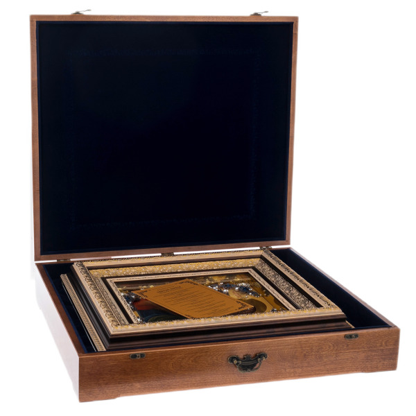 Икона бережно упакована в изысканный деревянный кейс, с отделкой из бархата, который защищает её и делает достойным подношением для тех, кто привык окружать себя только лучшими предметами, символизирующими их статус и стремление к совершенству. Архангел Михаил здесь — не просто защитник, а воплощение истинной силы и несломимого духа, который вдохновляет на победы и достижения.