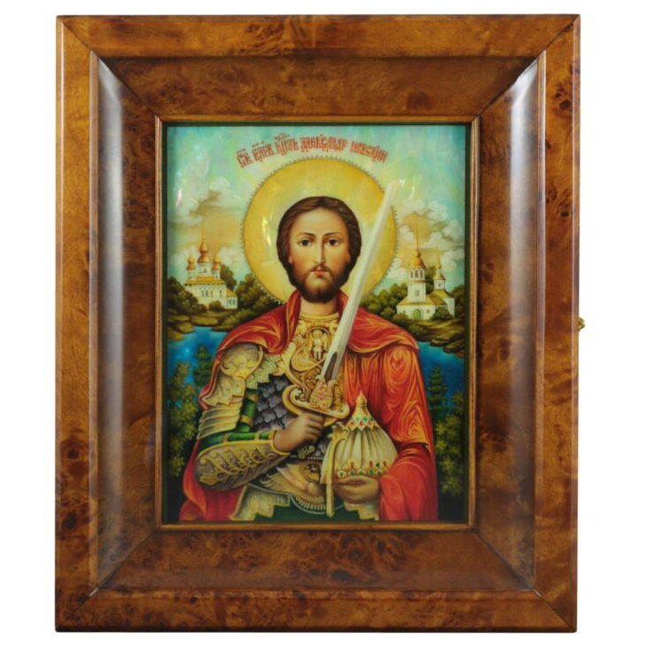 Икона на натуральном перламутре "Святой благоверный князь Александр Невский" в киоте