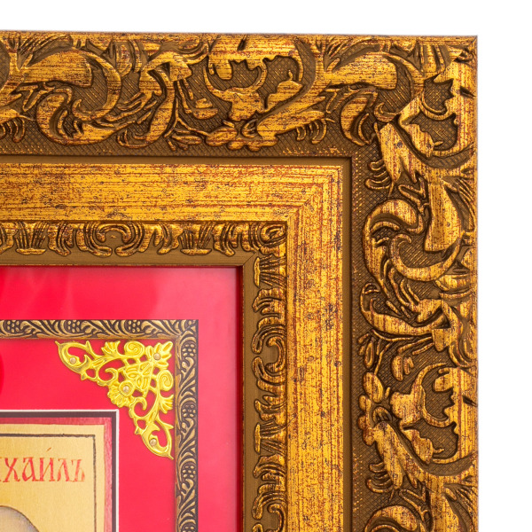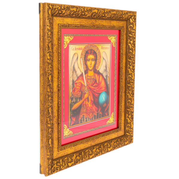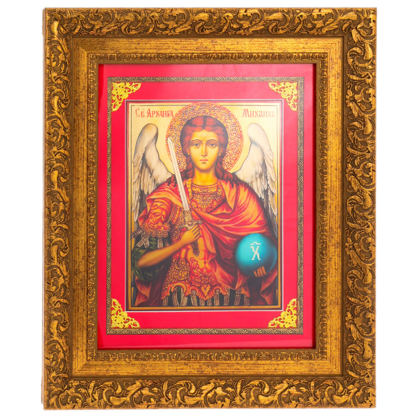 Икона «Архангел Михаил» на сусальном золоте — образ силы, праведности и небесной защиты, исполненный в торжественной иконописной традиции с использованием благородных материалов. Михаил изображён с мечом в правой руке и небесной сферой в левой — как вождь воинства Господня и страж духовного порядка. Облик Архангела — строгий, сосредоточенный, исполненный внутреннего света. Композиция оформлена в насыщенных красно-золотых тонах, где сияющее золото фона придаёт изображению особую возвышенность. Икона заключена в роскошную резную раму глубокого золочёного тона, подчеркивающую её торжественный и духовно значимый характер.