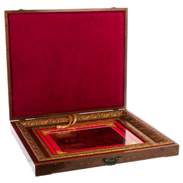 Изображение нанесено на сусальное золото — благородный материал, традиционно используемый в православной иконописи как знак святости и вечности. Каждый листочек золота вручную укладывается на подготовленную поверхность и покрывается тонким слоем защитного лака. Тончайшая печать позволяет сохранить насыщенность красок, проработку деталей и одухотворённость лика. Использование сусального золота не только подчёркивает важность образа, но и создаёт уникальный визуальный эффект — мягкое сияние, изменяющееся при разном освещении, будто передающее незримое присутствие благодати.