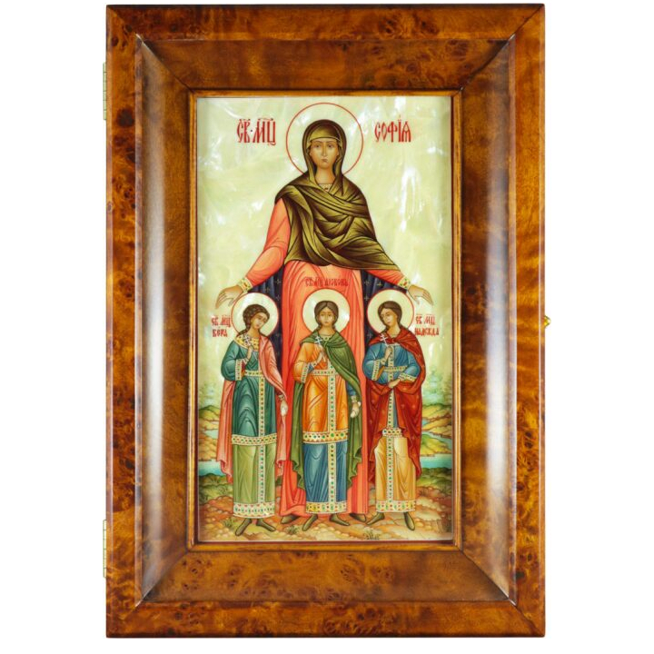 Икона в киоте "Вера, Надежда, Любовь и мать их София" на натуральном перламутре