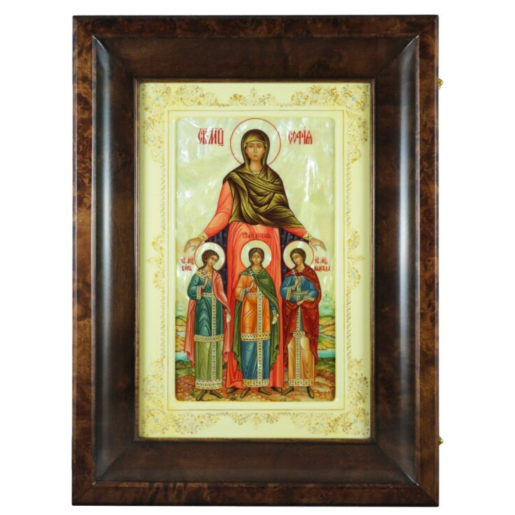 Икона "Вера, Надежда, Любовь и мать их София" на натуральном перламутре в киоте и белой раме