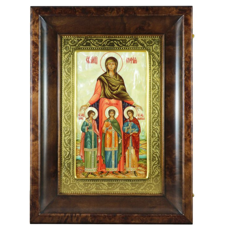Икона "Вера, Надежда, Любовь и мать их София" на натуральном перламутре в киоте