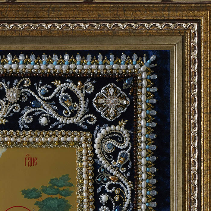 Орнаментальное шитье, украшающее икону, создано из материалов, подчеркивающих её исключительность: топаз, гранат, бирюза, кварц, циркон, хрусталь, жемчуг и перламутр. Каждая бисеринка, каждая золотая нить гармонично переплетаются в сложнейшие узоры, отражая замысловатую красоту Божьего замысла. Бархатный фон насыщенного синего цвета усиливает впечатление глубины и роскоши.