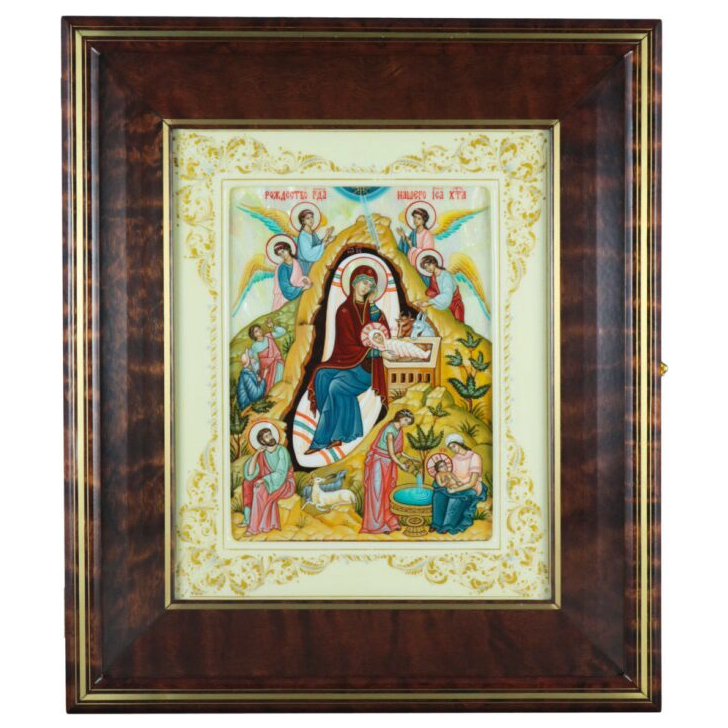 Икона "Рождество Христово" в белой раме и киоте на натуральном перламутре